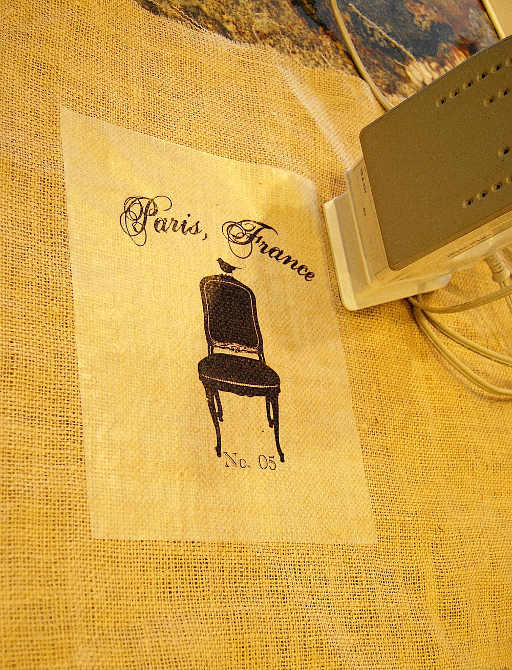 I wanted to make it cute, and one of the newest sponsor’s of the DIY Club is an adorable etsy shop called Olive Rue. I downloaded this image of a chair with a bird on it from Olive Rue and printed it on transfer paper {you must reverse out the image to do it on this type of paper}. Then I ironed it onto the burlap. I peeled off the backing and voila – an instanly cute focal point for my Burlap Magnet Board! I covered the metal sheeting with the burlap and flipped it over. I used Gorilla Glue Tape to secure the edges of the board. This tape is incredibly sturdy and sticky! Perfect for this project. Then I fit the magnet board inside of the frame and used my staple gun to attach it on the back.