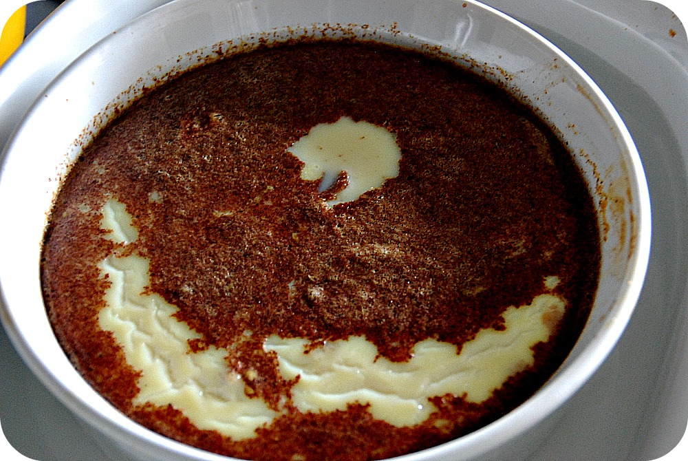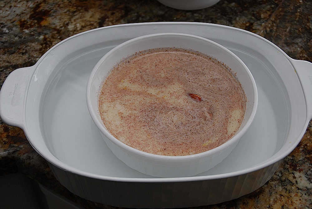 Put the dish in another dish filled with hot water. Insert into oven for 45-55 minutes, or until a knife can be inserted into the pudding and come out clean. Take out of oven and let cool. Then serve.