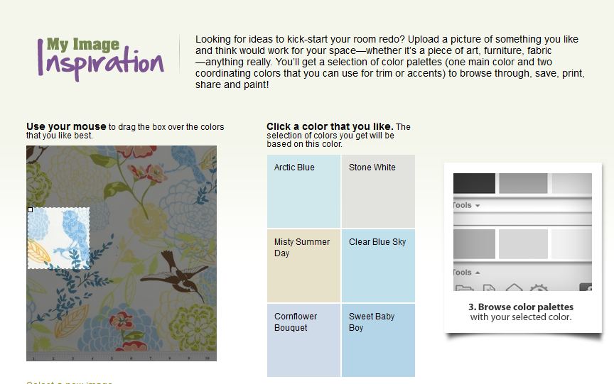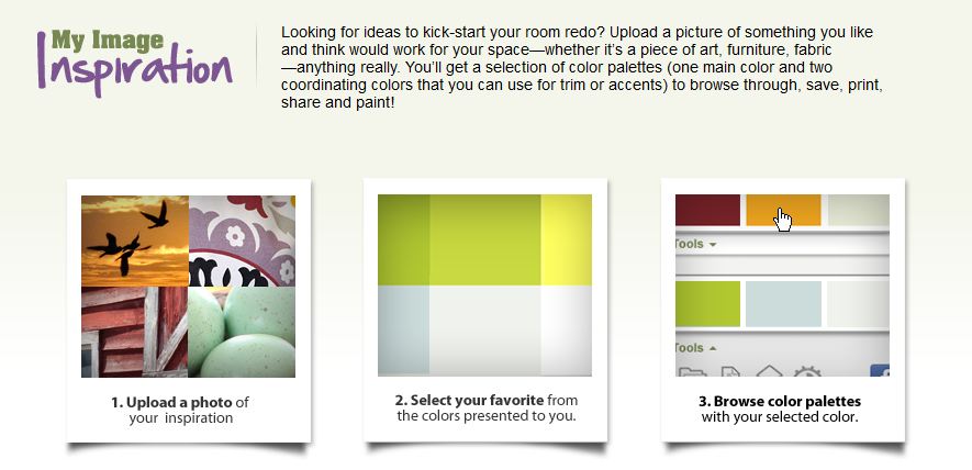 Plus, I am trying to come up with a better storage system for all of my crafting supplies. So I went on the Colortopia site, and I found a really cool tool that is helping me with my Craft Room Decorating Dilemma. It’s called — My Image Inspiration.