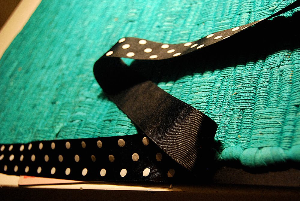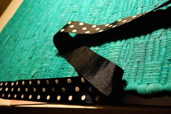 After that was done, I flipped the whole rug over and took my polka dot ribbon and matched up the edge of the wide ribbon that was sticking out from underneath and pinned that edge to the edge of the polka dot ribbon. I went all the way around the whole runner pinning it together. And where the rugs came together in the middle, I pinned ribbon over those seams too.