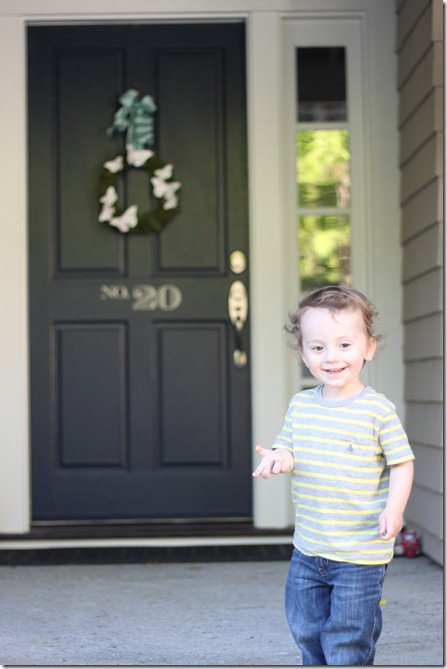 Beautiful!! The ribbon adds a really nice touch. Gorgeous front door and little guy out there too.