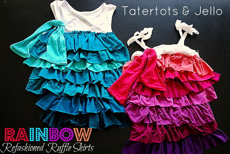 I’m sharing a little upcycled Rainbow Ruffle project there today. With three girls, we end up with a lot of hand-me-down clothes that have seen better days. This is a way to use those clothes that are stained or worn out without throwing them into a landfill.