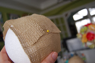 - Now attach the flowers onto the burlap balls. I used straight pins to arrange them on the ball ahead of time. Space the flowers out so that the burlap shows though the middle. Then I dabbed some Gorilla Glue onto the back of each flower. I then put a straight pin back in the middle of the flower to hold the flower on to the ball until the glue dried. Once the glue dried, then I pulled the pins out.