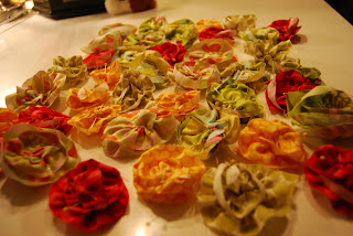 - Once the strips are gathered, make them into flowers. Take one end and fold it around in a circular motion until you have made a circle, make the circle a little bigger each time it goes around. It should go around about three times. Secure with a pin.