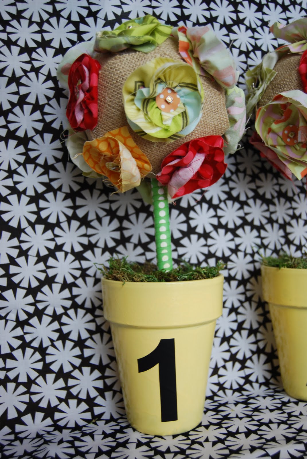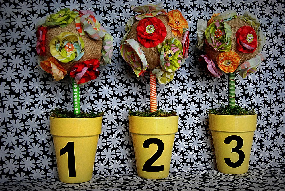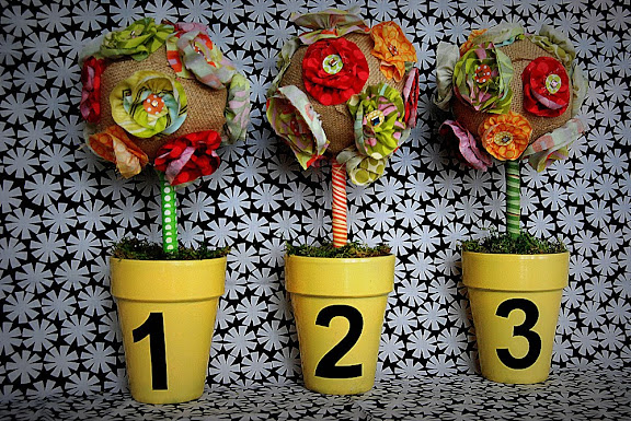 I used burlap as the background and then used the pretty fabric to make fabric flowers. They look so bright and Spring-y in my kitchen! The topiary would make a cute centerpiece on your table, but I decided to make three – I think everything looks better in threes, don’t you?