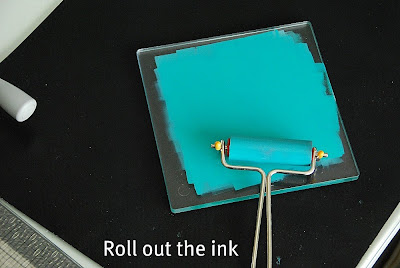 4. Then you take a SMALL amount of ink and roll it out on the clear square with a special brayer. And, I also found out that you can leave the ink out for a few days. It won’t dry out. So if you have another project to do, you can do it without worrying that the ink will dry out.