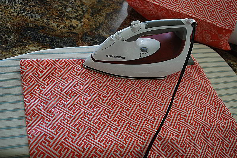 Take the two pillow covers, open the seams on one side of the napkin and then put it on the pillow. Fold down the excess from the middle of pillow and iron those seams, leave about 1 inch for seam allowance. Then sew down the back seams for a finished edge.