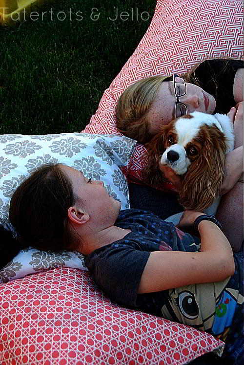 Love the patterns–they were way too pretty to just live as napkins. Pillows are a much better choice. 🙂 Love the shots of your girls with the dog. Cuteness!