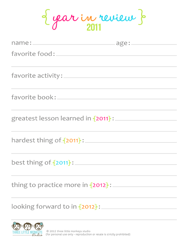Gretchen also has a wonderful blog — Three Little Monkeys Studio — where she shares great ideas and free printables like this Year In Review printable. Such a good idea. You can fill one out for each of your kids each year, save them and see how they change from year to year!!