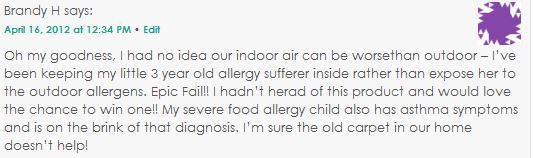The air IN my home may be 5 times more polluted than outside… WOW! I would LOVE to win this purifier!! Thanks for this great giveaway!